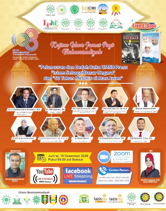 Universitas Muhammadiyah Sumatera Barat (UMSB) meluncurkan sekaligus membedah dua buku sekaligus secara virtual, Jumat (18/12/2020). Buku Ketua Pimpinan Wilayah Muhammadiyah Sumbar Shofwan itu, berjudul “Islam Sebagai Dasar Negara: Polemik Antara Mohammad Natsir versus Soekarno” dan “68 Tahun Melukis di Atas Awan, Memoar Biografi Dr. Shofwan Karim”.